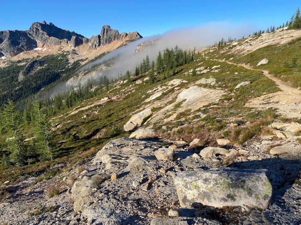 We awoke to wet tent flys due to overnight condensation. Immediately after leaving camp, the PCT switchbacked up Cutthroat Pass. During the ascent I saw nothing due to a thick fog to either side, but the sun broke through at the top. It revealed an alpine landscape of low-lying shrubs and rocks with scattered trees. I caught up to the others; ahead of us a fog waterfall rolled across the trail. When I entered it, the temperature dropped dramatically, and I was glad for my fleece and gloves.