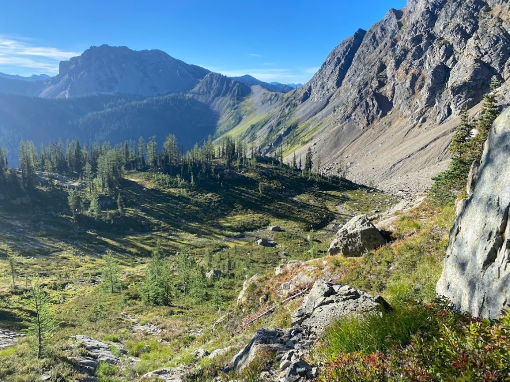 Within the first couple hours on trail, I spotted three adult grouse, four hunters in camouflage, and a deer with two-point antlers that bounded quickly away. The morning fog lifted to reveal a sea of mountains stretching into the distance. Then I reached Hart’s Pass. The pass is 30 miles from the border and where hikers return for a ride if they can’t walk into Canada. We met a nice lady ranger with two labradors.