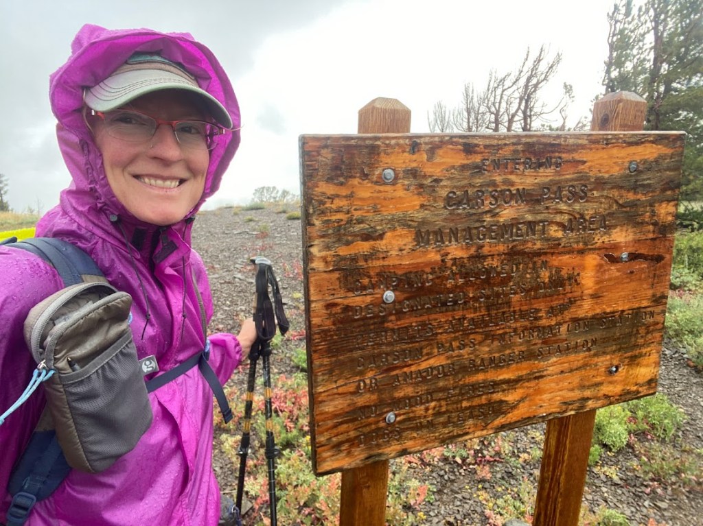 Midafternoon, I arrived at the Carson Pass visitor center. There was trail magic consisting of Nature Valley bars and other misc. snacks. I chatted with volunteers Todd & Sarah while I had a couple snacks and dried out a little. Then I hustled towards the Carson Pass area high point. It started to rain again and I got damp. Shortly into the descent, there was a snowy patch with a well-worn boot track.