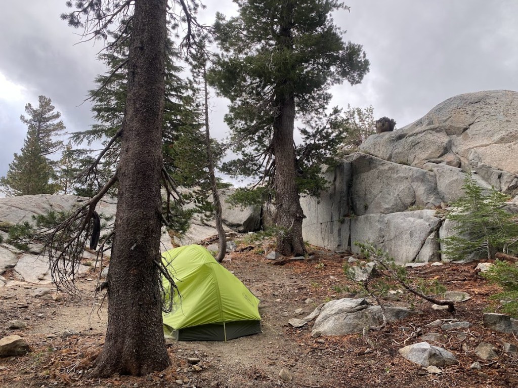 Another chilly morning, though this time I wore pants and did not need my puffy. I passed a lake that was mirror smooth, reflecting trees and mountains. My muscle strain did not hurt at all. That it recovered with a night’s rest gave me confidence about finishing the trail. Meanwhile, in our group chat, Sandbag is getting off trail in Mammoth Lakes due to a knee injury. That’s a bummer!