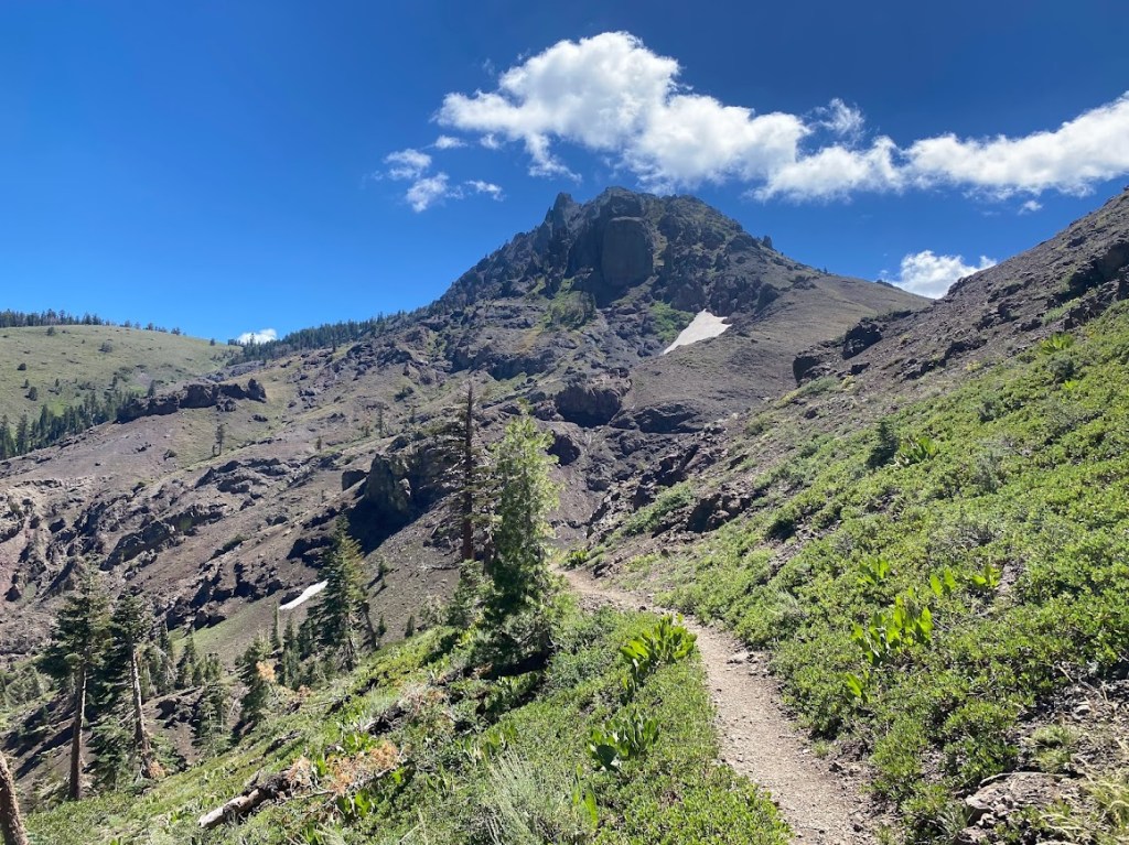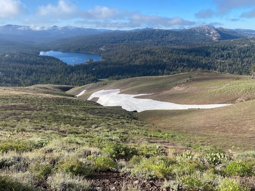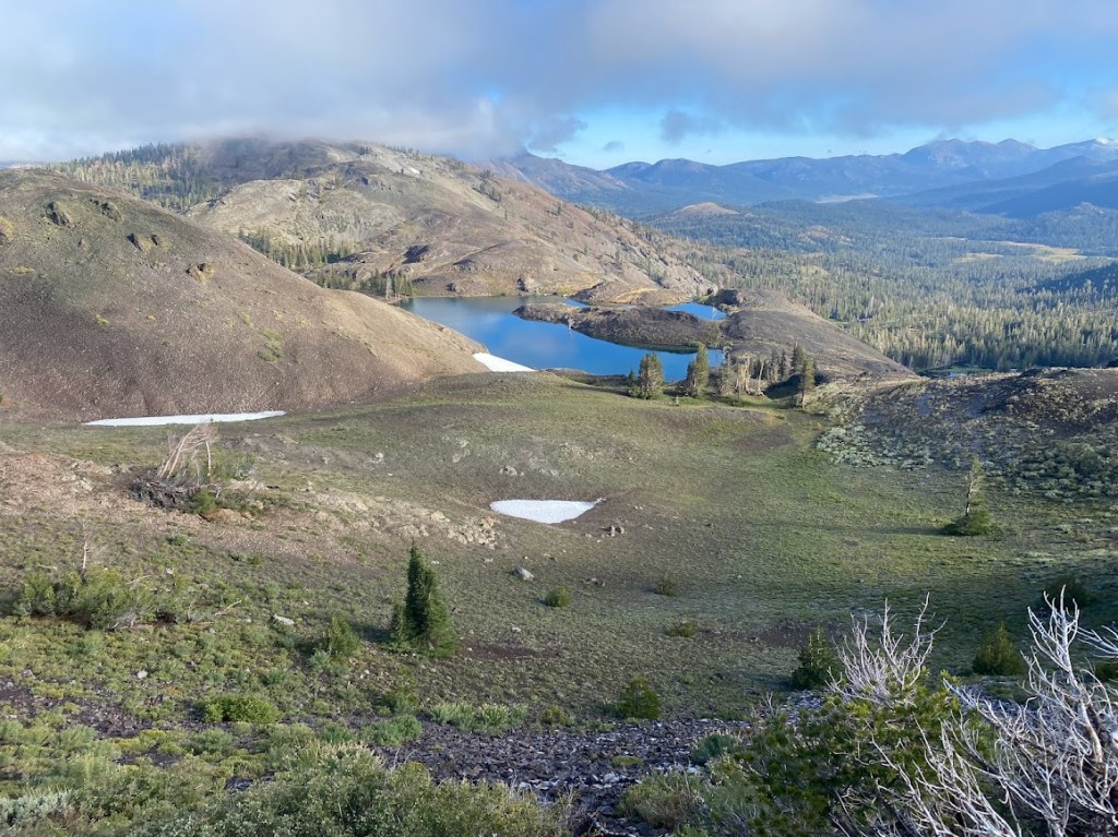 It was a delightfully sunny day and the terrain was gorgeous. There were sweeping vistas, patches of snow, and blue lakes of varying size. I particularly liked East Lost Lake with its horseshoe shape and Lower Blue Lake with its scattering of rock islands. Eventually I took a delayering break and before noon I took a snack & drying break on a rocky outcrop overlooking Tamarack Lake.