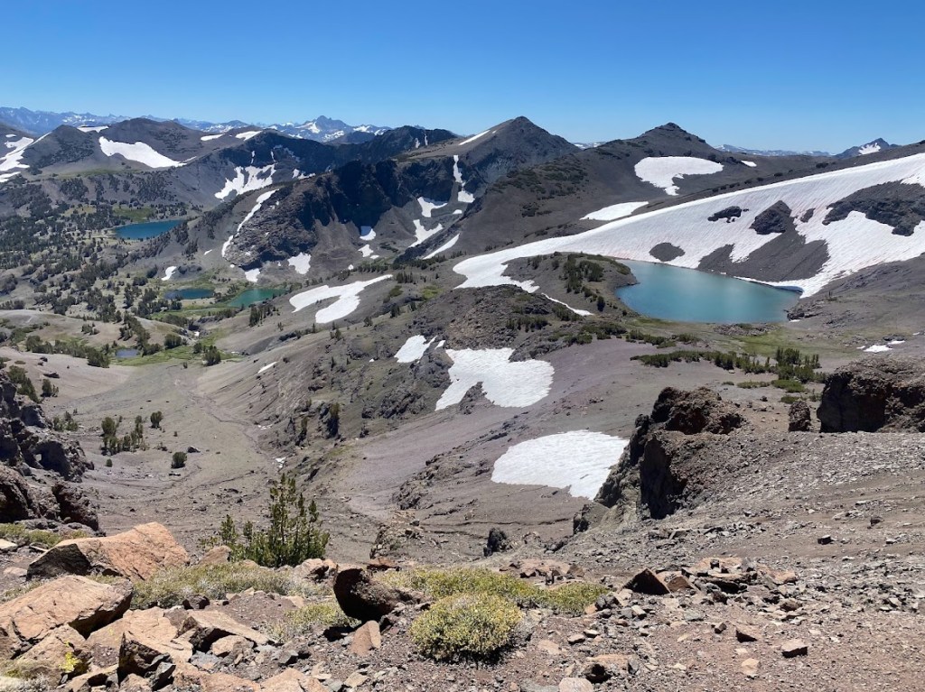 At 10 am, Gary gave seven of us a ride back to the trail. We had an immediate climb up the south side of Sonora Pass. Though it added two extra pounds, my bear canister felt okay in my pack. The views as I ascended were magnificent, but the view down the other side surpassed them. Latopie Lake was a turquoise sheet edged by a snowy slope. In the distance were the darker blues of Koenig and Leavitt Lakes. The trail curved around the valley and met a steep snowbank, which I climbed, thankful for the large cleats on my new shoes.