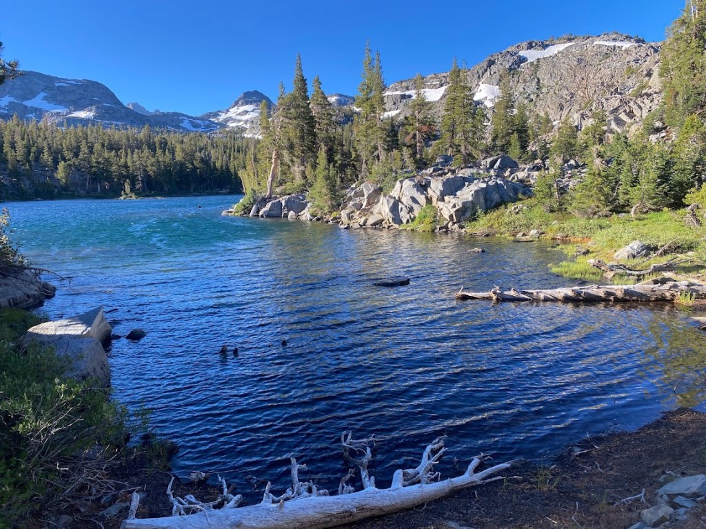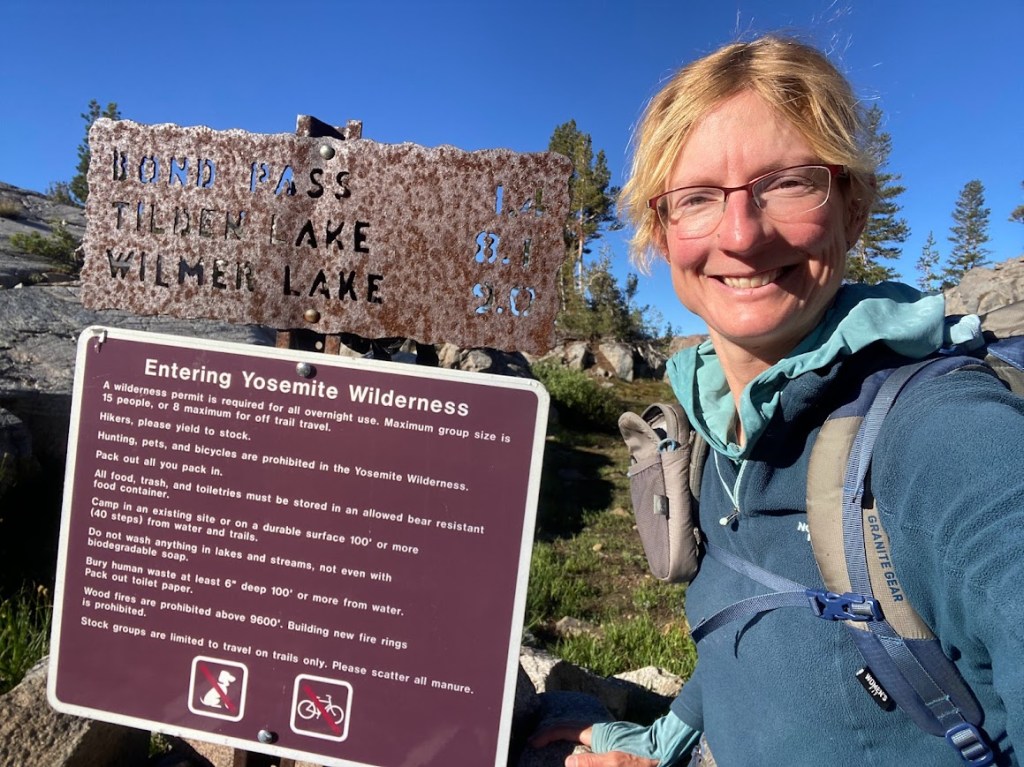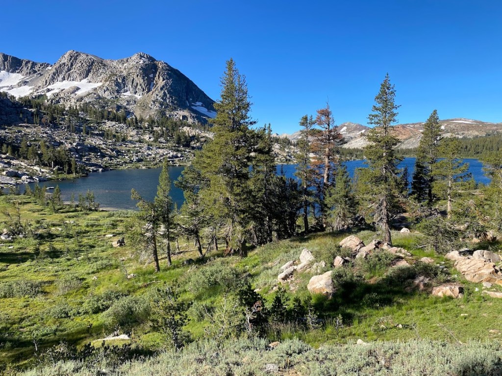 The day’s first five miles took me past a series of lakes with female names: Harriet, Bonnie, Stella, and Dorothy. As I passed Harriet, a breeze rippled the surface. At the top of Dorothy Pass, before dropping down to the lake, I entered the Yosemite Wilderness. Dorothy was a busy lake, with an elaborate tent camp and a couple fishermen.