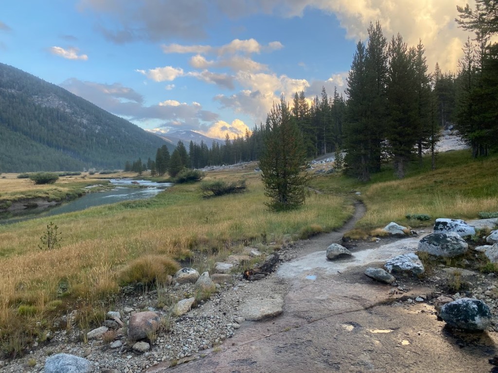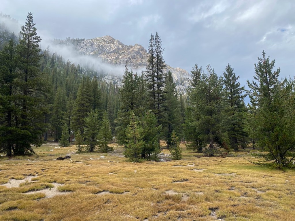 Eventually I reached Tuolumne Meadows and dumped my food trash in a trash can, yay! The rain would not let up and I had to hike so I got soaked. At this point the trail wasn’t well marked, FarOut is almost impossible to use when both your finger and the phone screen are wet. Under an awning, I had a mini breakdown. I was cold and had ~5 miles to go before I was permitted to camp. A tiny part of me wanted to quit, though I know not to quit on a bad day. I remembered the AT; how Cricket & I walked 20 miles and set up tents, all in the rain. If I did it once, I could do it again.