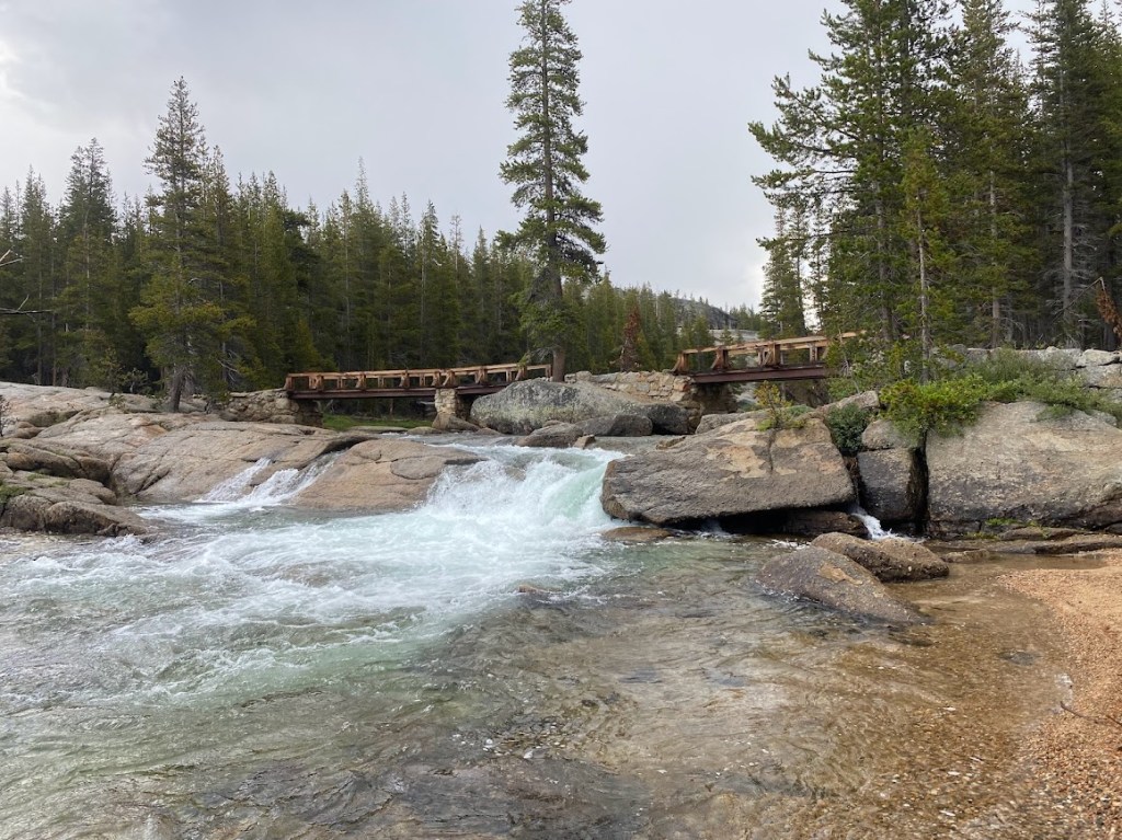 A long, gentle downhill brought me to White Cascade and Tuolumne Falls, both scenic. It began to drizzle so I took a snack break under a tree. The trail crossed the Tuolumne River on a neat two segment bridge with a large rock in the middle. Afterwards it meandered alongside the river, the terrain alternating between large flat rocks and trees. It downpoured and hailed; I hid under a tree for the worst of it.