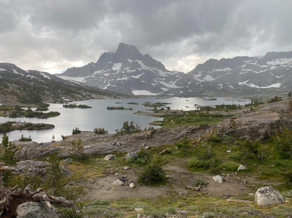 Suspicious clouds appeared on the horizon, so I descended the pass quickly. Near the Davis Lake junction I caught up to PBS. We put on rain gear and began climbing Island Pass, chatting about the AT. Unfortunately, it began to rain and thunder… again. Luckily Island Pass was shorter and less exposed than Donohue. Still, when I descended it and caught sight of the very impressive Thousand Island Lakes, I wished I could see it in the sunshine.