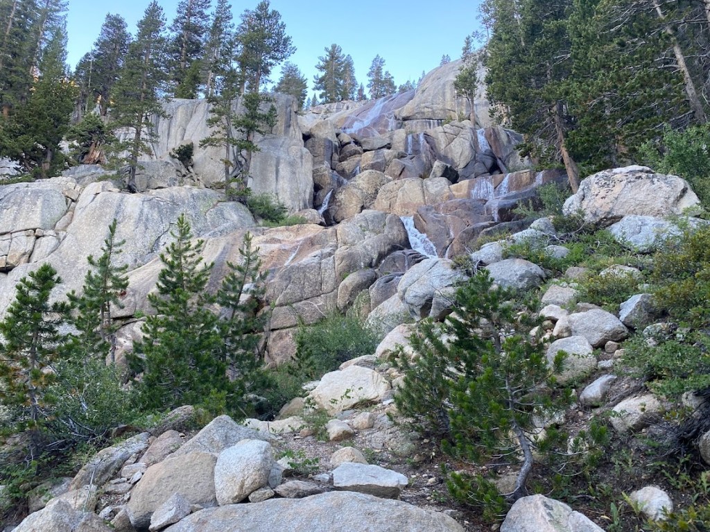 To start the day, I continued the descent from Silver Pass. My favorite feature was a cascade that poured over huge slabs of rock. At the bottom, a side trail lead to Vermilion Valley Resort, a resupply/ meal opportunity for hikers. PBS headed there when I went into Mammoth Lakes.
