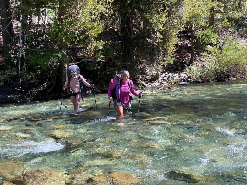 About 10:30 am, we reached the S. Fork San Joaquin River where the bridge was out. We were nervous about the ford, but NoBo’s we met made it sound easy. Then there was a crossing sign 0.1 mi. before the demo’d bridge. A nervous JMT gal joined us. It was only slightly over my knees at the deepest spot and the current was moderately strong. I felt safe the entire time.