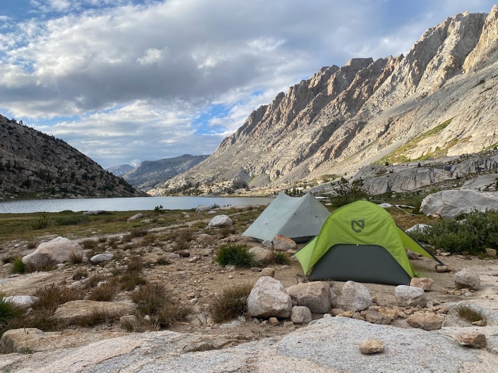 Soon I was on the golden staircase. Pikas squeaked at me and a brief, light rain fell, however I dried quickly. As it got dark, I found a great spot on a rock ledge with sand enough to stake two tents. PBS showed up after dark and I called out to her. We ate dinner. My headlamp died (I’d charge it later) so I borrowed her headlamp to fetch water.