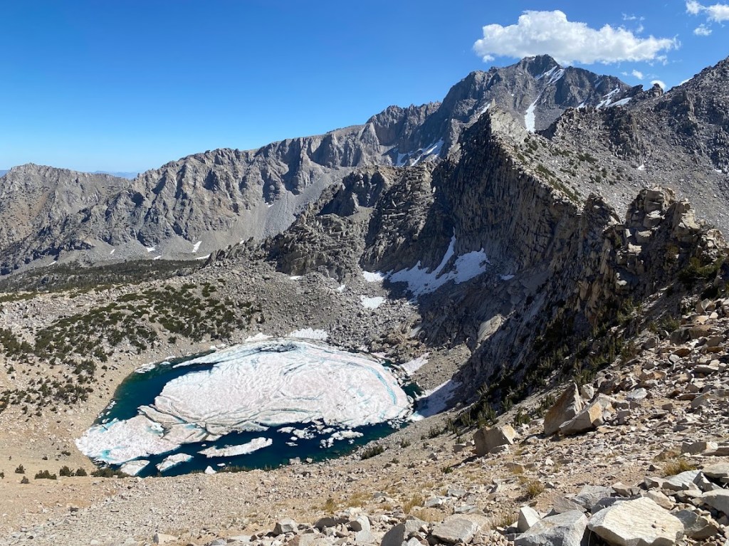 Then PBS and I parted ways, though I hope to see her at the base of Whitney or at KMS. I quickened my pace, eager to reach town and get a meal. Glen, 11,957 ft, was a pretty pass, with the scenic Rae Lakes and a cluster of unnamed lakes directly below the final climb. It was steep at the end with one semi-sketchy snow field.