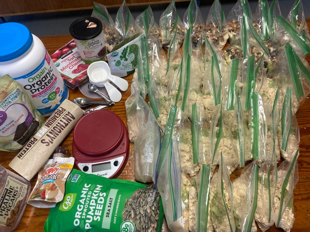 At 20 miles per day, the 800 mile Arizona trail would take 40 days; adding in zeros, I figured 42-45 days. Since the resupply towns were mainly small, I decided to send all my food through resupply boxes. On my way back from our final ridgerunner training in Virginia, I renewed my Costco membership and stocked up on favorite items. After an Amazon order and a couple grocery store trips, I began food preparation. I assembled breakfasts, lunches, and dinners, each with 20 grams protein and 600 calories. Meals included three varieties of oatmeal based breakfast, taco & ramen dinners, and snack style lunches.
