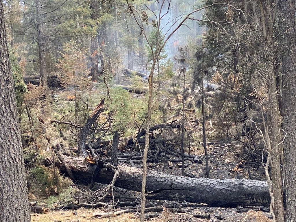 Between road miles 6 & 4 (measured towards Highway 87) and to my left, I saw occasional pockets of smoke, areas of burned ground, and twice campfire sized patches of flames. At times, the smoke was within 10-20 feet of the road. It was eerie to see bits of unattended fire burning so close. I began to question my plan to camp along the road until, for a mile, pristine woods filled the left side and I regained confidence. Then, to my right, I saw a camping area and a couple with a car and huge tent. After chatting with the guy, I set up my tent nearby.