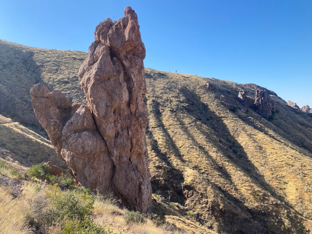 As I was low on water and wasn’t sleeping well, I rose early. It was still dark when I got on trail and stars sprinkled the sky. I used my headlamp until the world became a light grey. Rocky hillsides towered to the east and shaded the trail past sunrise. After two hours of hiking, I reached the rainwater collector. The metal structure had a spigot in the side for water access and an overflow trough for wildlife. While there, I made coffee and ate a snack.