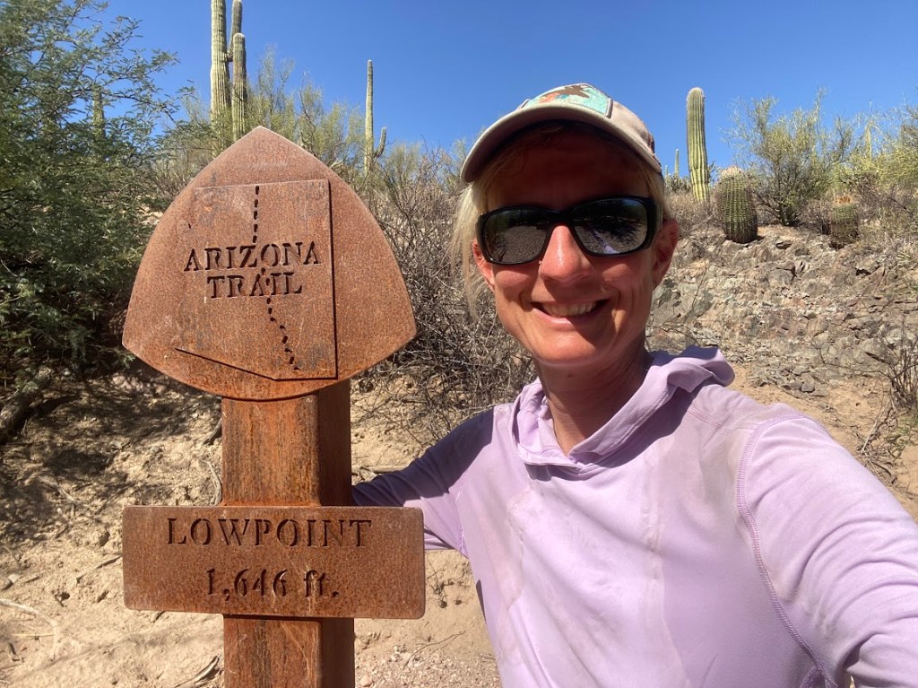 It was a scenic descent from the collector, winding past a cool rock tower. In March, there were huge patches of California poppies, not this time of year. Shortly after I ate lunch, a sign marked the trail low point, 1,646 ft. (The high point was 9,139 ft., on the Kaibab Plateau.) Then the trail turned east and paralleled the Gila River. I felt thirsty and accessed it three times for water, each time I startled cows.