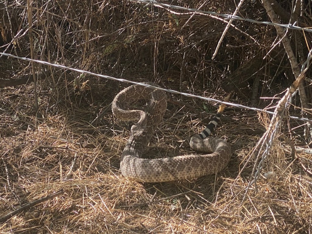 Arizona has 13 species of Rattlesnake, more than any other state. The two I saw were Black Rattlesnakes. A handsome species for sure, but I wanted to see another variety. I kept thinking that as I walked along. The trail dipped to the river and went through two gates. Going through the second one, I heard a rattling noise to my right. It was a Western Diamond-backed Rattlesnake. Yay!! It was not happy to see me, it arched impressively and buzzed continuously. I didn’t want to stress it so I got a picture and moved on.