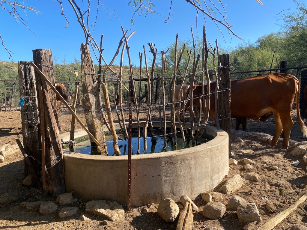 The day’s first water stop was Beehive Well. On the right was a windmill and a giant, circular metal tank. When I peered over the lip, the water was too far down to reach, however, I’d seen a cattle yard on the area’s other side. It had an open gate with a half dozen cows inside. Their circular trough had a spigot with an attached float and it was trickling clear water. As the cows stared and bees buzzed around me, I gathered water from the flow.