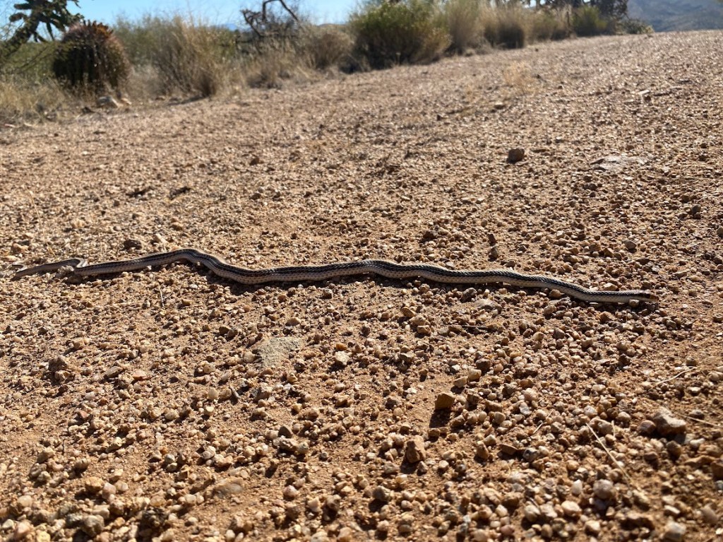 For the most part, the trail stayed off roads today, though it dipped in & out of a lot of washes. My left foot twinged occasionally, I can’t wait to get my new shoes in Oracle! While on an ATV road, I spotted a Western Patch-nosed snake. It was really cute and let me take several pics; it never slithered away.