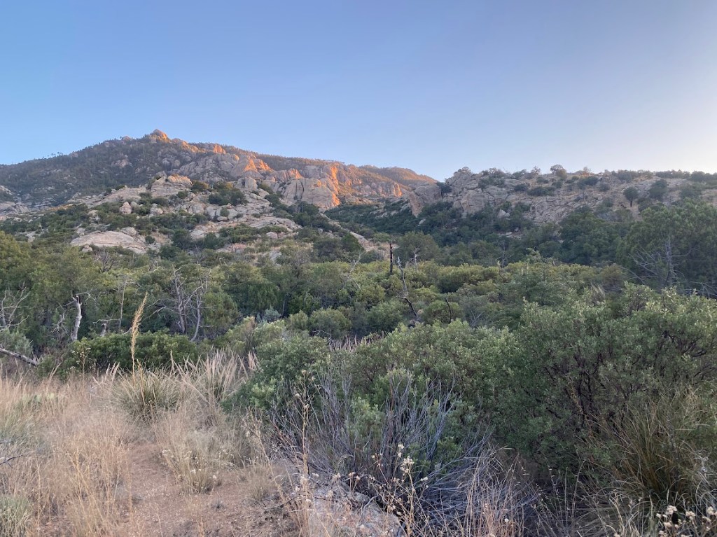 A couple miles later, we reached Manning Camp, one of two designated campsites within the park. There was an informative & friendly ranger. She showed me where to find the creek water pool and we geeked out over our mutual admiration of rattlesnakes. I asked her about sky islands, a term Mike mentioned yesterday. These are high elevation pine-oak woodlands, like on Mica Mountain, each with a unique ecosystem of critters unwilling to travel across the arid desserts in between.
