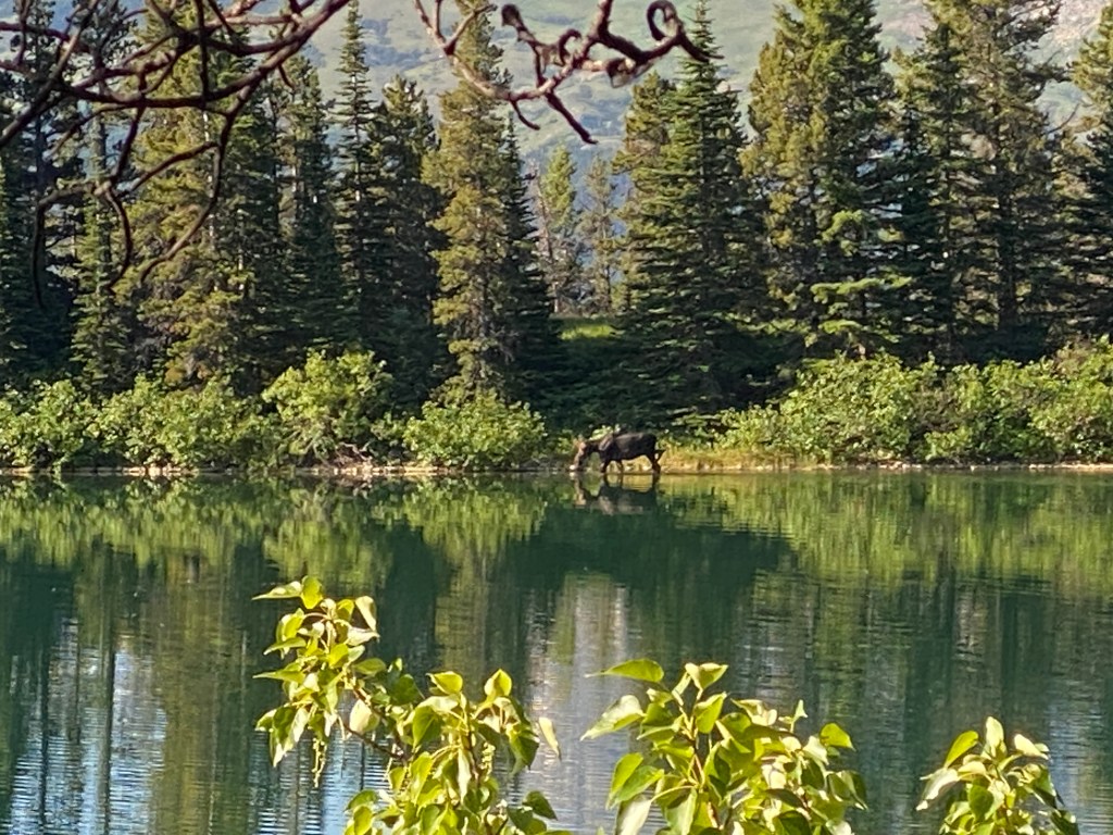 At Swiftcurrent Ridge Lake, I hear splashing and quickly spot a bull moose walking along the lake’s edge. He is alternately munching on bushes and water plants. Wendy and I watch him for a while, until he leaves the lake and disappears into the forest.