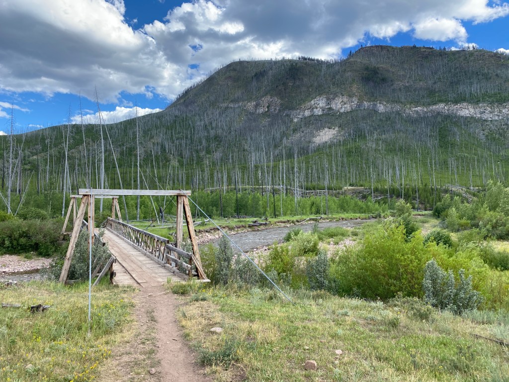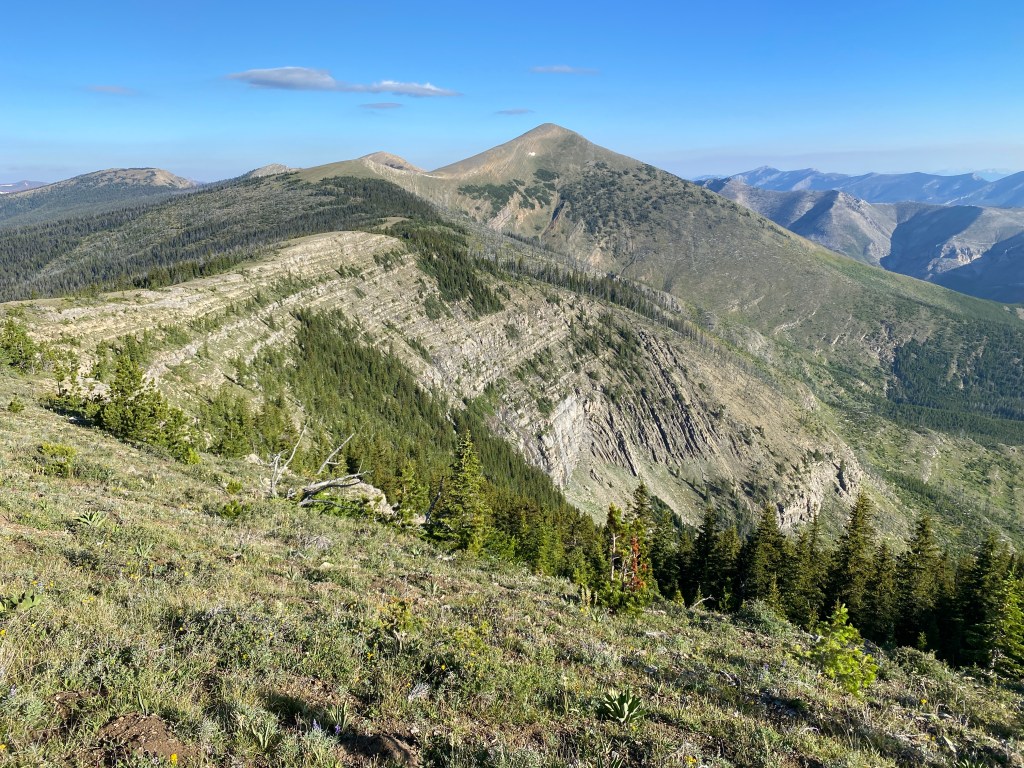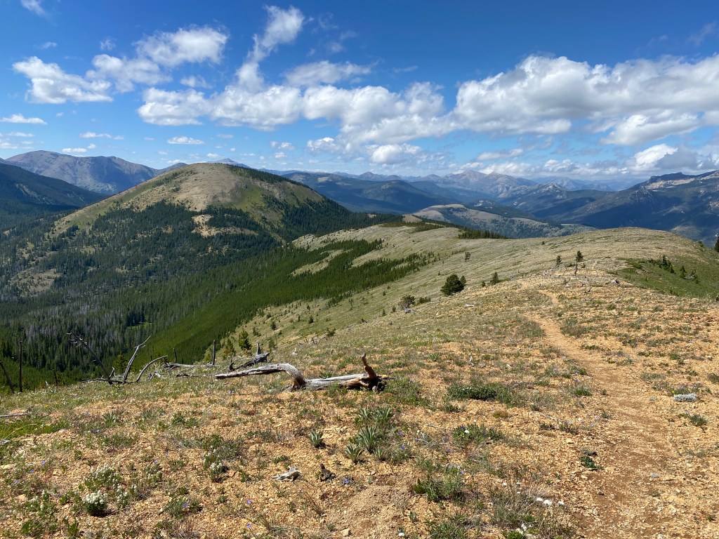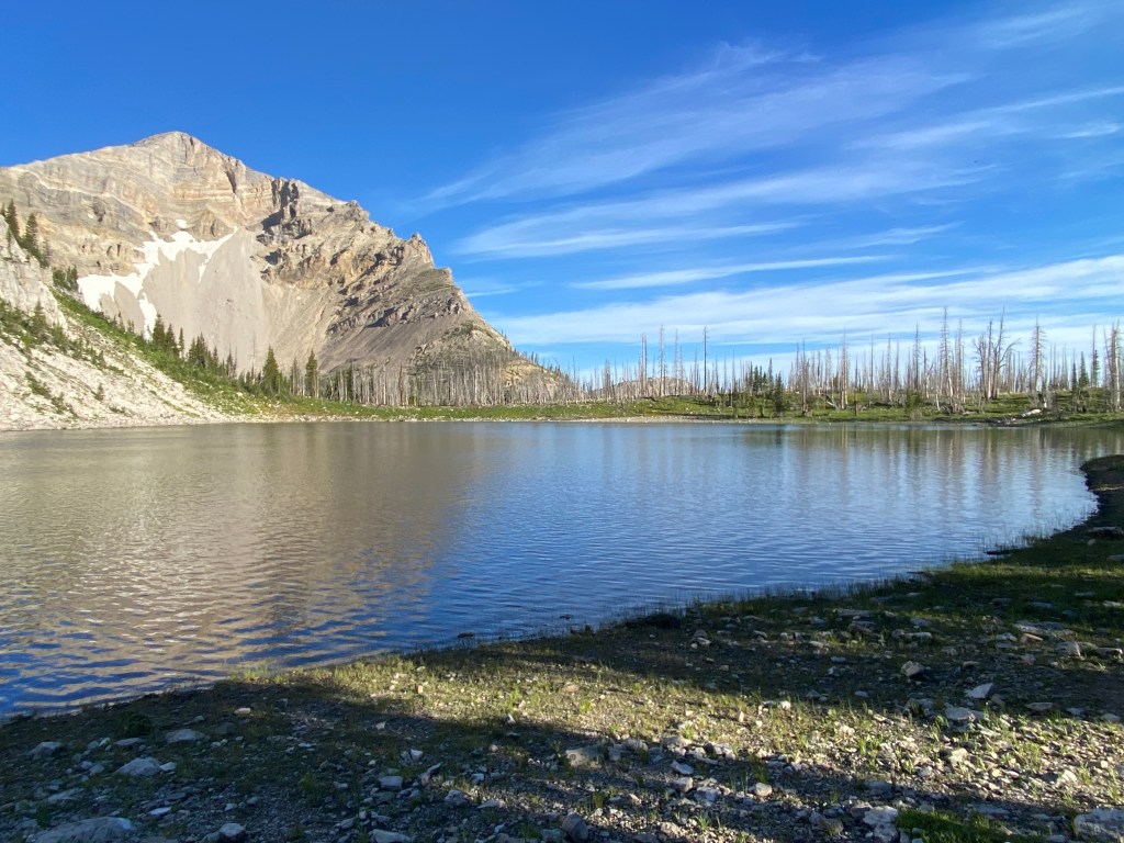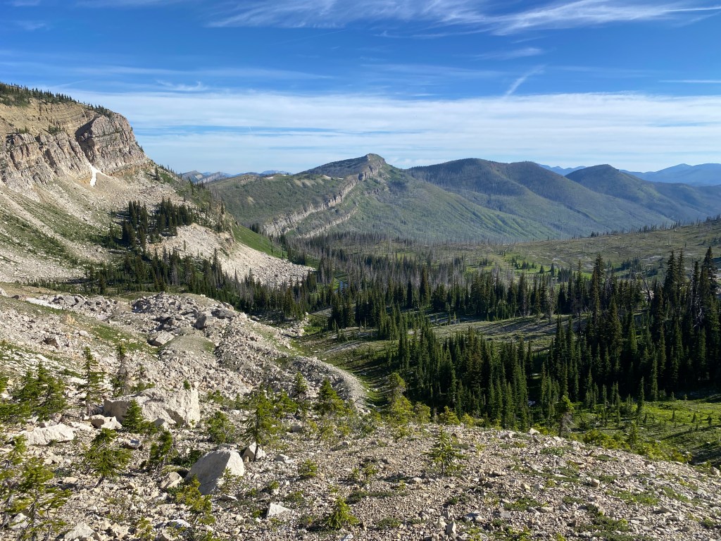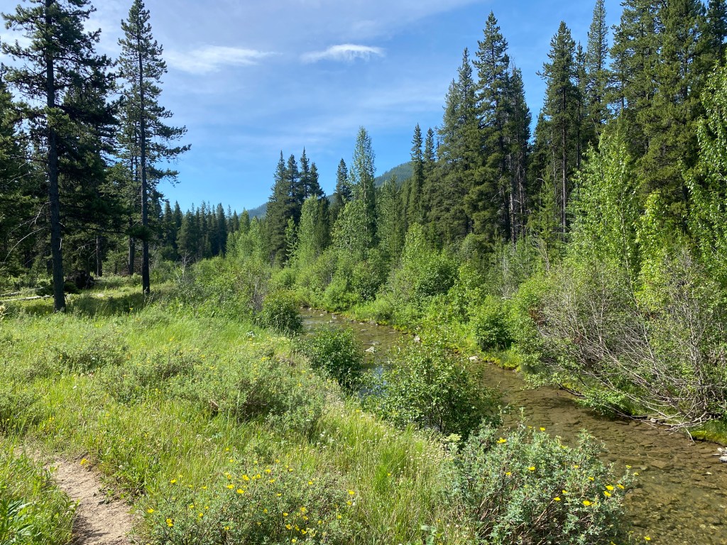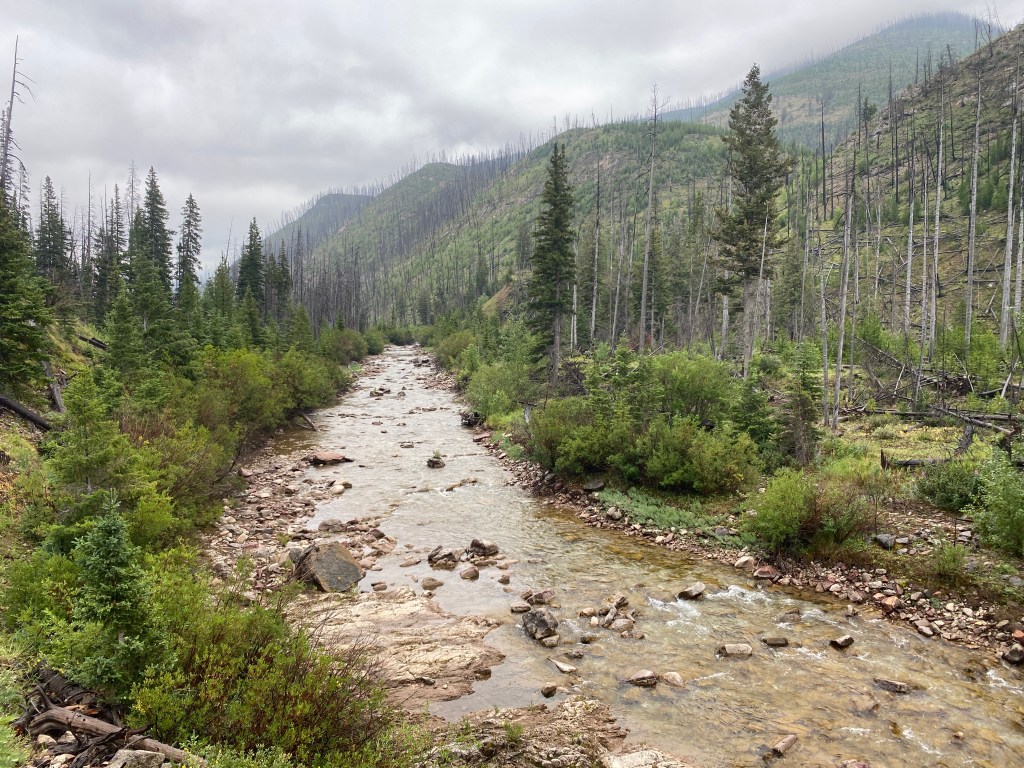 After an unnamed pass with a cool rock slab that marked the end of the wall walk, the trail was a meander through pleasant woods and alongside streams and rivers. I encountered several backpacking groups and a couple with horses. In the end, I was back in old burn territory, there’s so much of it in The Bob! On the bright side, most of it is recovering well.