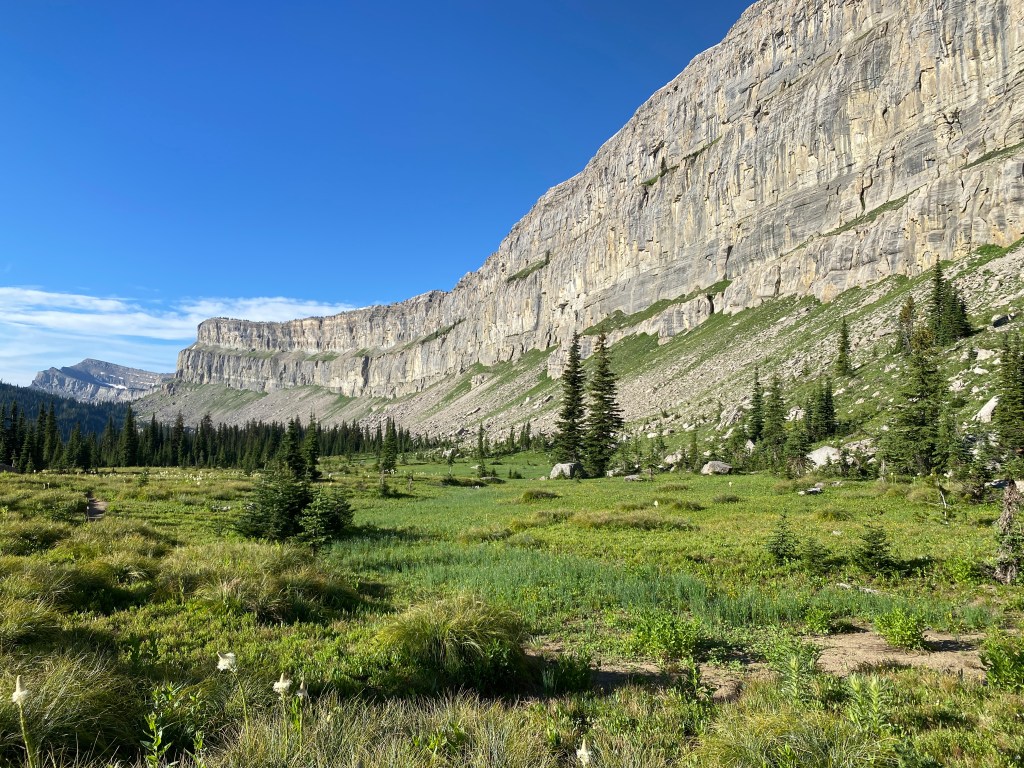 For six miles, I hiked along the base of the Chinese Wall. It was stunning! I kept stopping to take a picture or examine the massive wall of rock. I thought how much my dad would enjoy it. I was also intrigued by the grassy green bench about half way up and what it would be like to sit upon it and look down.