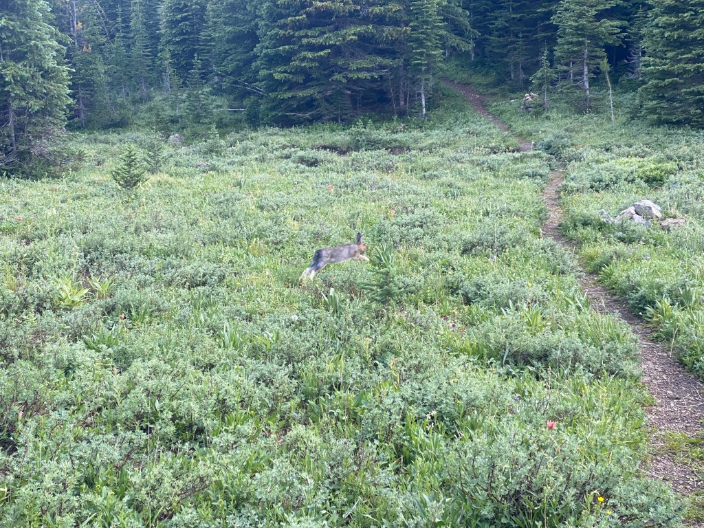 In town, I picked up my resupply box from the Blue Sky Motel. The desk clerk also gave me Wendy’s box. Then I walked over to the Wheel Inn Tavern where I camped in the backyard along with Mamacita and Bugs Bunny. I caught up with family and friends, got a shower at the campground down the road, and sorted my resupply. Town time flies by!