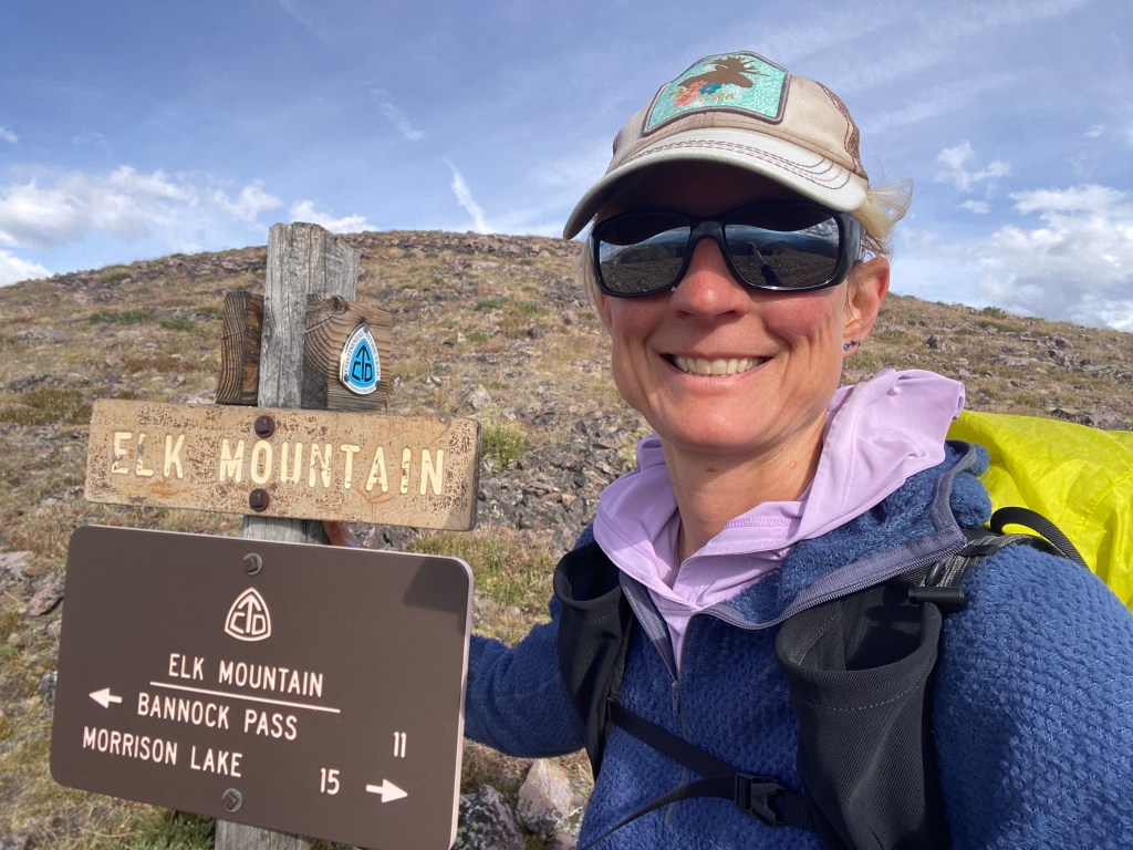 I fought a strong cross wind for most of the climb. Dark clouds loomed and rolled past, letting loose the barest precipitation and giving way to sunshine now and then. At the top, I was just below Elk Mountain, the highest point so far on trail, ~10,100 ft. From there, I descended to a spring where I filtered water and ate dinner. Another 1.5 miles and I found a spot, out of the wind, to camp.