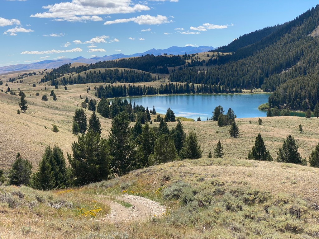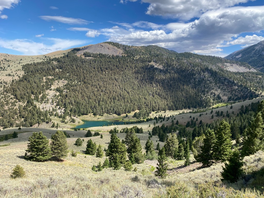Earlier the day became sunny and the early afternoon offered striking vistas of tree dotted hills with mountains beyond and clouds above. I saw two pronghorn in a field. The top of a long yet gradual climb offered a view of Deadman Lake. It was an intriguing turquoise color. The trail descended to Deadman Creek and brought me alongside the lake before climbing again via a series of switchbacks.