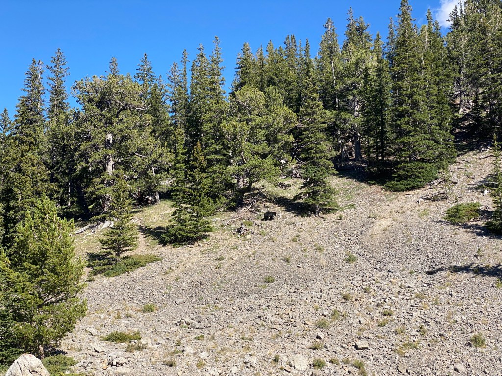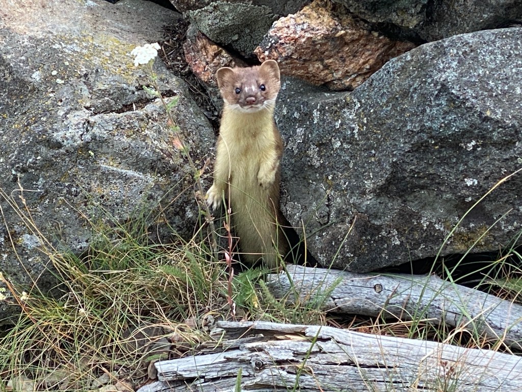 Waking from a good night’s sleep, I was slow to leave my sleeping bag so I got a late start. The sky was entirely overcast. After 2.5 miles, I passed a small lake and turned uphill. A post in a squat rock cairn marked the way and a long-tailed weasel popped out of the rocks! It played peek-a-boo with me, seemingly quite curious. The weasel was absolutely adorable and I was delighted by the encounter.