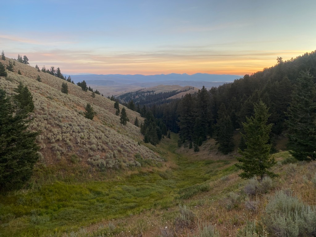 The day featured a couple more critter sightings! On a sunny hillside, a Western Terrestrial Garter Snake lay across the path. Afterwards the trail took me on another ridge traverse, this one marked by cairns and posts, the trail a faint line that I occasionally lost. As evening fell, I descended into a valley. I sat to filter water from a creek and heard an odd series of hoots. A young elk ran across a hill. It was joined by several adult elk and another young one. A short distance later, I camped in a flat spot under sheltering pine trees.