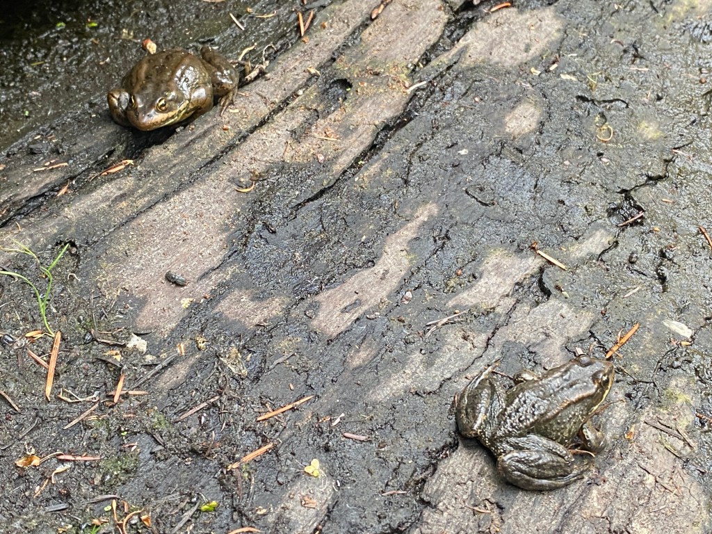 Getting out of a town always involves elevation gain. This one started out with a gradual road walk that transitioned to trail after 7.5 miles. On top of Little Table Mountain, I enjoyed the flat terrain and took a snack break. The trail then dropped down to dry Pete Creek before it ascended once again. At a murky, shallow pond, I observed two Columbia Spotted frogs.