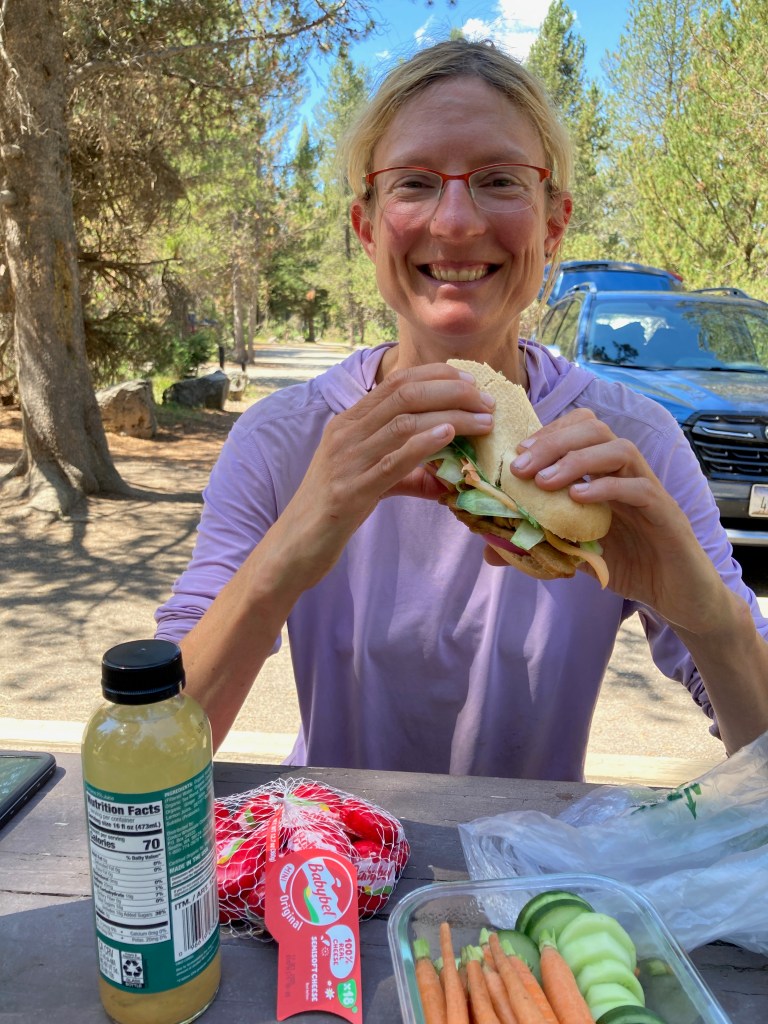 My sister arrived and we gave one another a big hug. She immediately set out some snacks. Busted had a hard-boiled egg then took off towards Yellowstone. Our original campsite was in the fire evacuation zone so we drove to the Upper Coffeepot campground on Henry’s Fork River. We found a lovely, empty spot with a shaded picnic table. Jenessa immediately laid out an elaborate, amazing lunch: tempeh bahn mi sandwiches plus homemade hummus with dipping veggies.