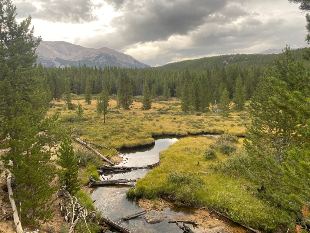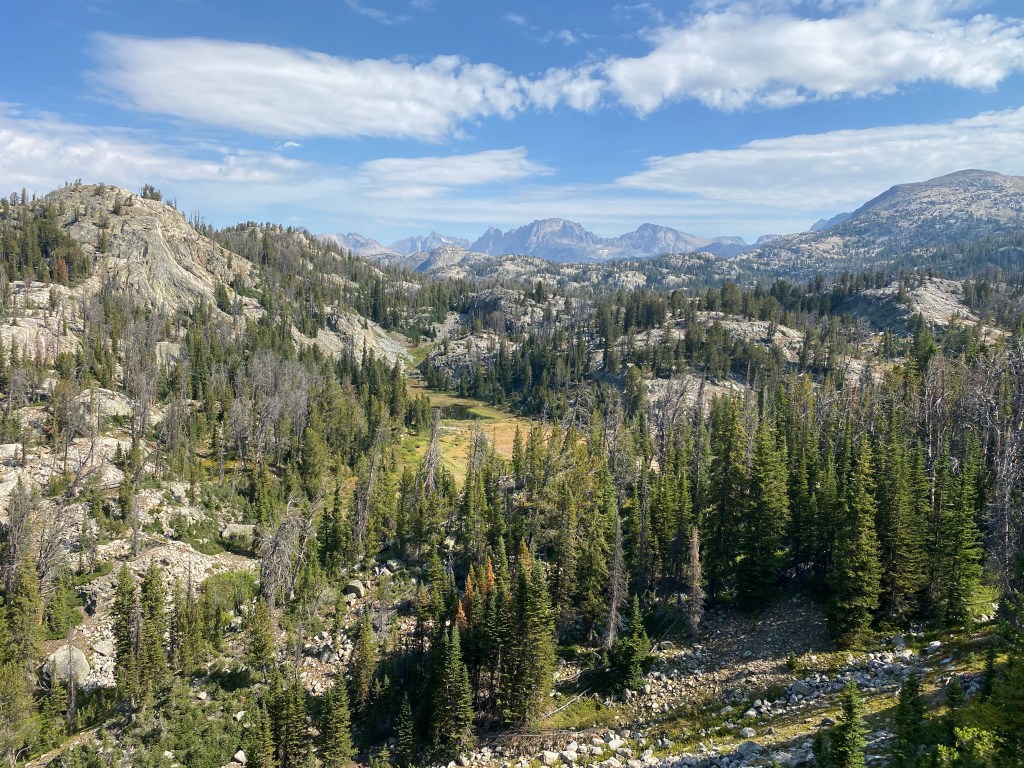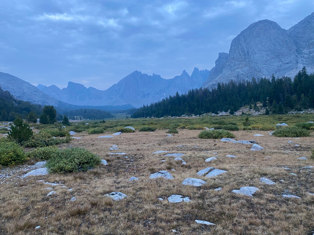 For four miles, I hiked a gentle descent alongside Little Sandy Creek and through a lovely valley. Then I did a short climb over the hill to the west of Little Sandy lake, a mile of navigating downfall, and the Cirque of the Towers alternate came to an end. I was so happy that I traversed the picturesque terrain, yet sad to have blasted through it. Happy again that I didn’t get rained on. I will have to return and explore further.