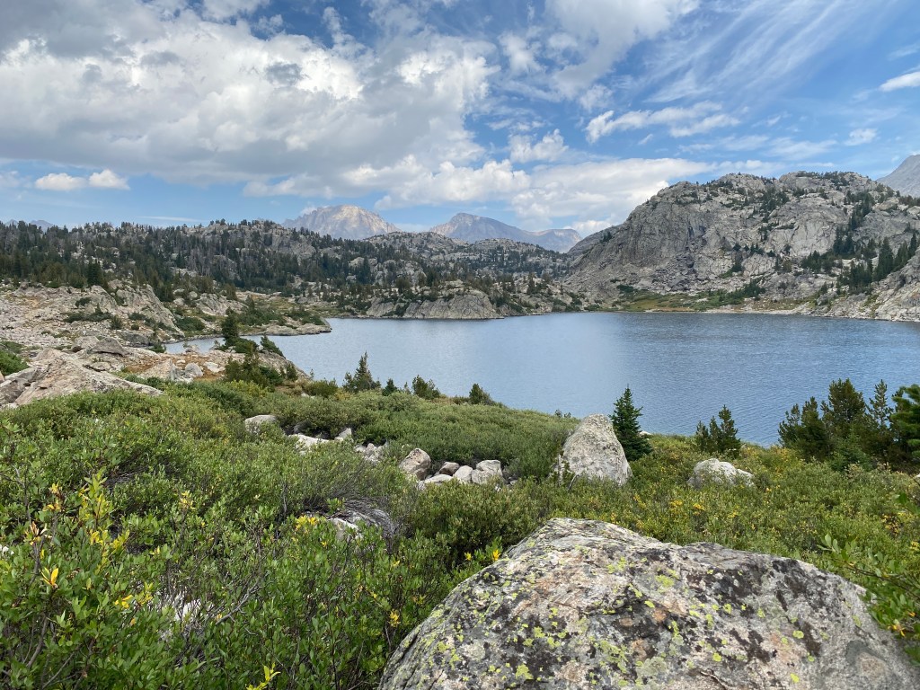 As the day progressed, I felt really happy. The Wind River range lived up to its beautiful reputation. Of the many lakes, I admired their unique features such as a rock island or sandy peninsula. I watched a reddish brown hawk, with a white spot near its tail, skim low over the ground. I also finished the third Mistborn book and thought the ending was great. Mid-afternoon it started to hail so I sheltered in a tree cluster; soon the ground was white to either side. The hail transitioned to rain. When I got back to hiking, I made a game of dodging the puddles that littered the trail.
