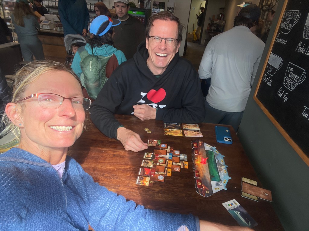 Will and I looked through coffee shop photos until we found one, Rocky Mountain Coffee Roasters, that had large tables. We played Duel of Ages with the Pantheon expansion and he won after we tallied victory points. Then we went to Walmart to get my meds and returned to the park pagoda for a late lunch of chik’n, sweet potato, & onion tacos (except we put them on chips). Afterwards, it was time for him to return to Boulder and me to hit the trail. Will drove us to Copper Mountain and we hugged goodbye. I felt thoroughly nourished by our time together.