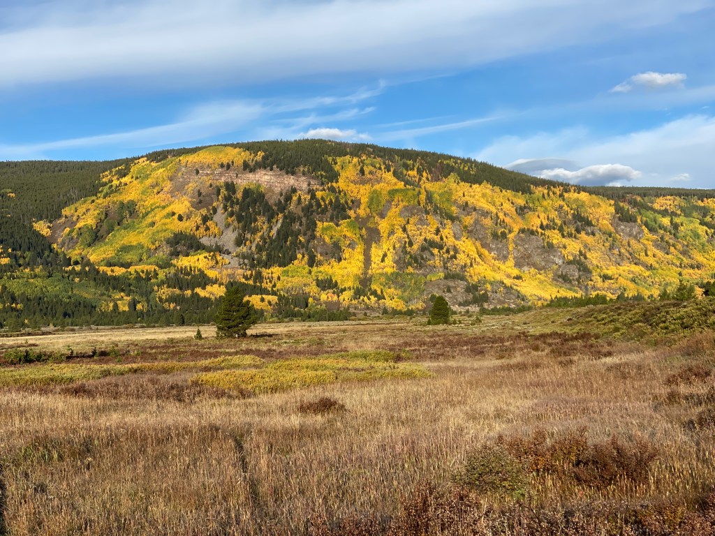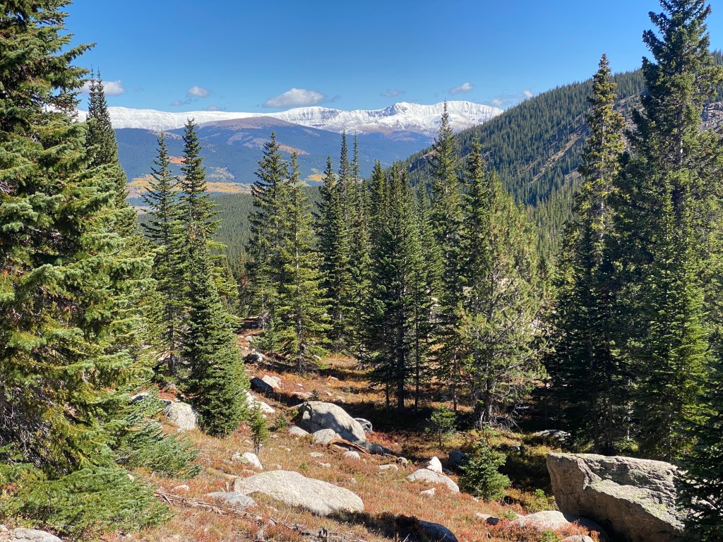 It started out chilly, there was a little frost on my tent and I ate breakfast with gloves on. However, it was one of those sunny, blue sky Colorado days that I love! My right eye was almost normal and I could see clearly other than blurriness from the ointment. Apparently Strix & her tramily camped a couple miles north of my spot. I chatted with Lark twice: near the top of the first climb and as he turned onto the Mt. Elbert trail. He and Strix planned to summit Mt. Elbert, Colorado’s tallest peak.