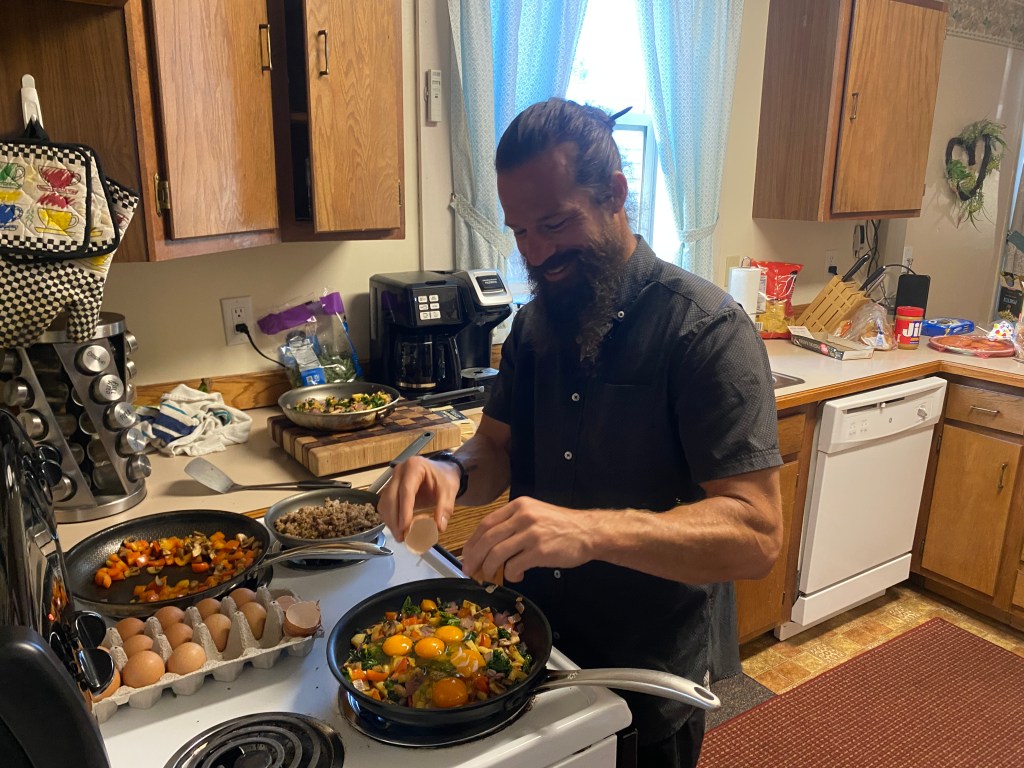 I woke from a night of crazy dreams. My eye was slightly less swollen; it appeared to be on the path to recovery! After taking care of it, I headed to the kitchen to drink coffee and assist Dijeridoo with the frittata. First he had to find appropriate pans for cooking the ingredients and the final product. No easy feat as the house had an odd assortment of dishes and some were in sad shape. I helped wash pans and chop veggies, which included sweet potato, kale, red pepper, onion, & mushrooms.