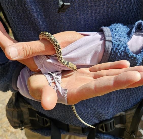Over time, the trail transitioned to a dirt road. Just beyond a cattle guard with a metal gate, a sign declared “foot traffic allowed on road through private property”. Apparently this was the reason for the route being abandoned, the official trail could not traverse what became private land. I spied a Gopher Snake laying in the road. Quick Draw caught it and we took turns allowing it to slither between our hands. He taught me the needle differences between pine trees and junipers.