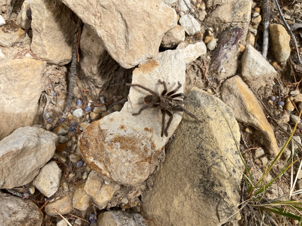 After lunch, we began a rocky descent that dropped us from 8,000 to 6,500 ft. The terrain changed drastically, juniper and cholla cactus replacing the pines. It also got drier, warmer and there were impressive sandstone rock formations. I spotted a tarantula and we paused to observe it. Then the trail dropped into Arroyo del Yeso, traveling back and forth across a creek that I bet was flowing only due to the recent rains. There was a ranch property sign and the appearance of day hikers.