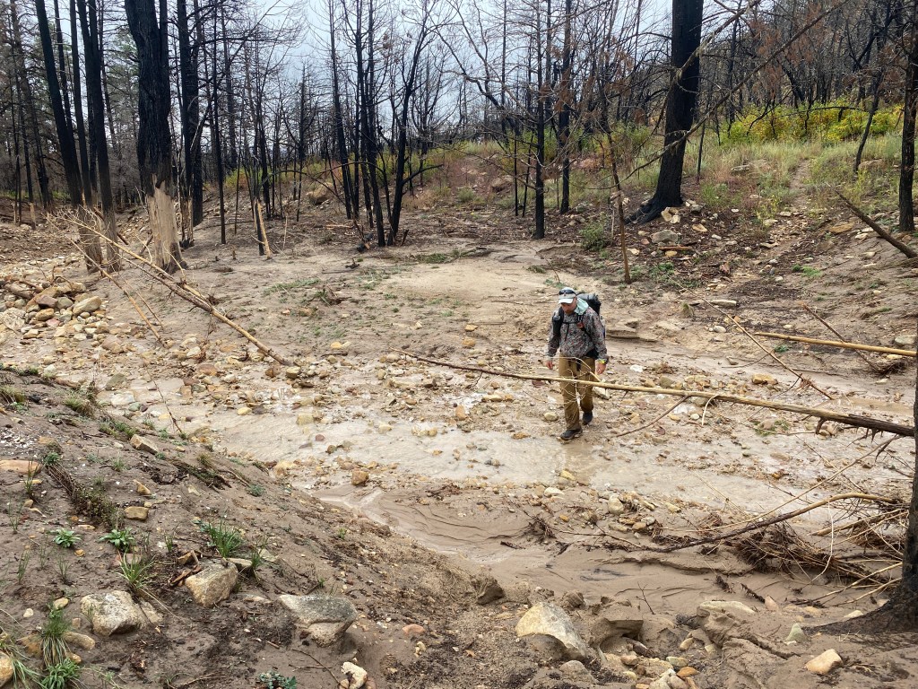 About 7.5 miles into the day, we came to a mile of trail that had been demolished by a flash flood. The trail had paralleled a creek bed. A shallow stream flowed through the bed, which we followed at times or crossed to scramble through debris and bits of trail to either side. At times, whole tree trunks, piles of broken limbs, or a washed out bank blocked the route. It was impressive destruction! At the end, I happily began a steep climb away from the potentially dangerous area.