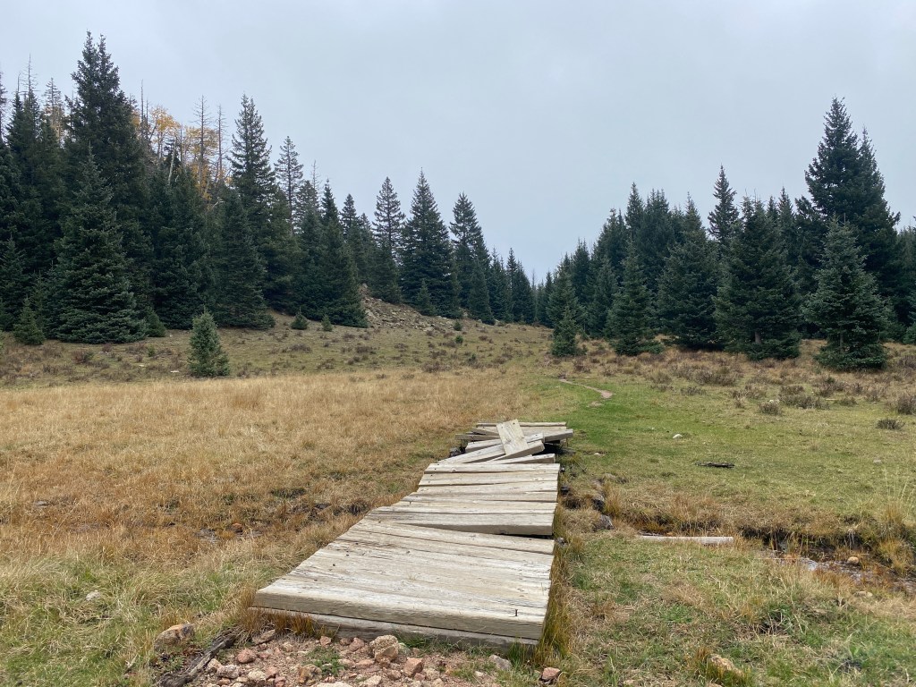 With a desire to hike miles before possible rain, we were out of camp by 6:25 am. Over six miles, we ascended to 10,525 ft, where we layered up due to mist and wind. Another 2.3 miles brought us to the old CDT junction, a route not marked in FarOut as a possible alternate, yet shown in the topographic background. According to Flavor Town, it would save us 4-5 miles of hiking to Cuba. We decided to give it a try.