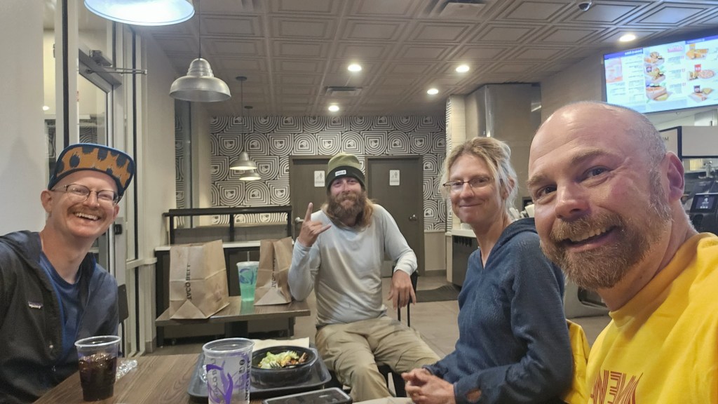 Top Shelf hiked into town in the evening. Quick Draw and I met Flavor Town and Stripes for dinner at Taco Bell. It was fun to catch up with Stripes. I hadn’t seen him since the Butterfly Hostel; Quick Draw hiked a bunch with him and Phoenix early on in the trail. Flavor Town took off and Top Shelf joined us. Then Top Shelf, Quick Draw, and I headed to Dairy Queen for further food items. Afterwards, we headed to our separate hotels to make the most of town luxuries.