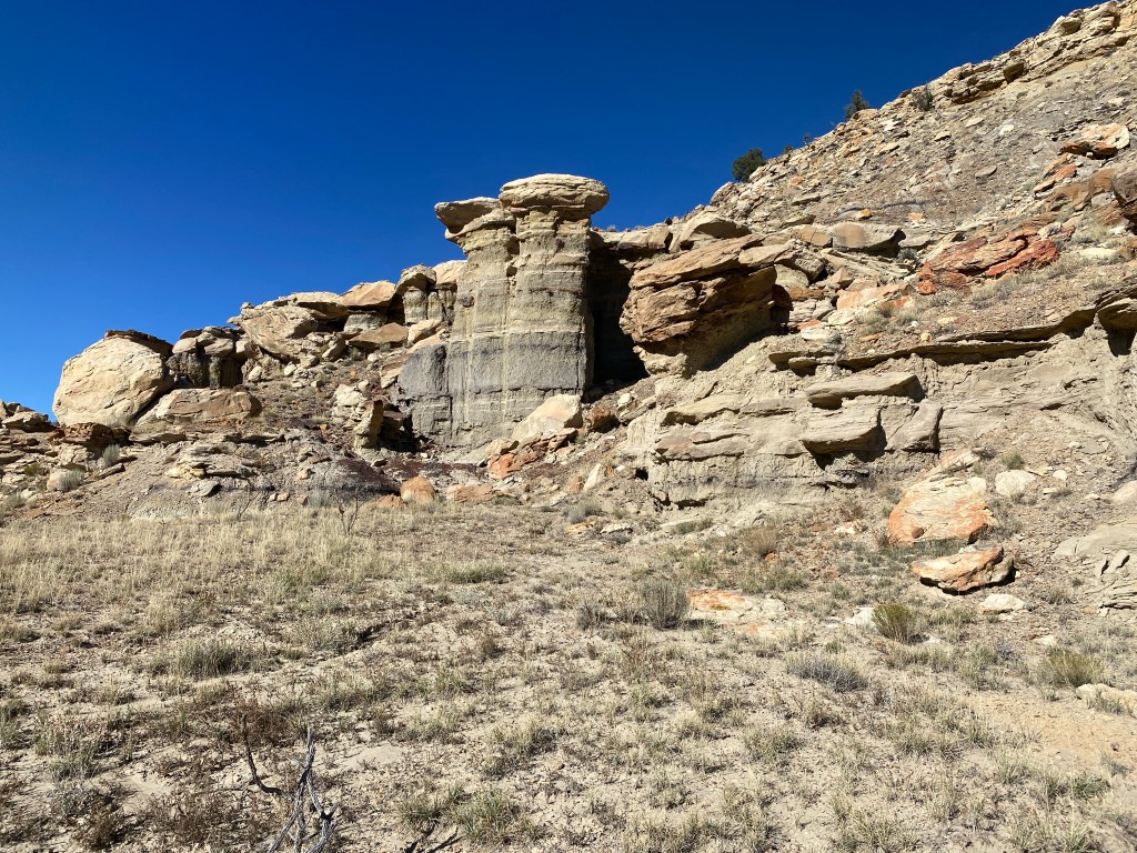 The 14.6 mile water source was three large tanks and a spigot. It was good, clear water with no taste so I carried a little extra. We did a lot of cliff top walking, the trail stayed up high to circle around valleys and offered sweeping views of distant rocky knobs. Occasionally there were sandstone towers or flattish rocks balanced upon soft, weathered stems that gave them the appearance of mushrooms.