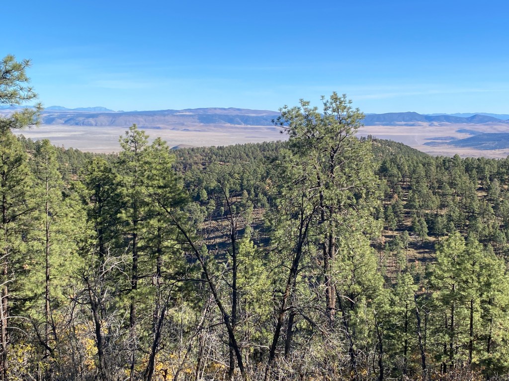 Shortly after lunch, a canyon alternate split from the trail, allowing access to a series of water tanks. We stayed on the official CDT, though it was apparent most hikers did not as the trail became fainter and was sometimes obscured by branches and pine cones. I did occasional trail clearing, thinking of Quick Draw, who had done so on a daily basis when we hiked together. I was happy we chose the high route, it offered a great view across hills cloaked in ponderosa forest to the distant San Agustin Plain.