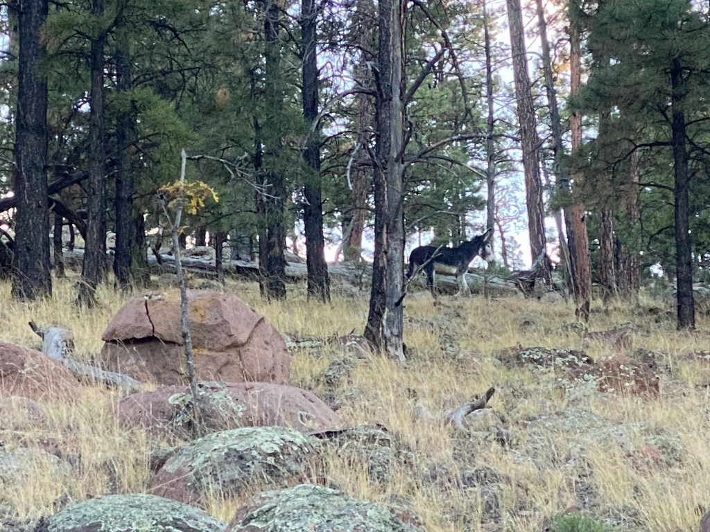 Shortly after sunrise, Top Shelf spotted a coyote. We watched it run off and become a silhouette against the blue sky. It watched us and then it howled. We heard answering howls from first one, then two directions. It was neat! I hear coyotes a lot at night, but I think that was the first time that I had seen one howl.