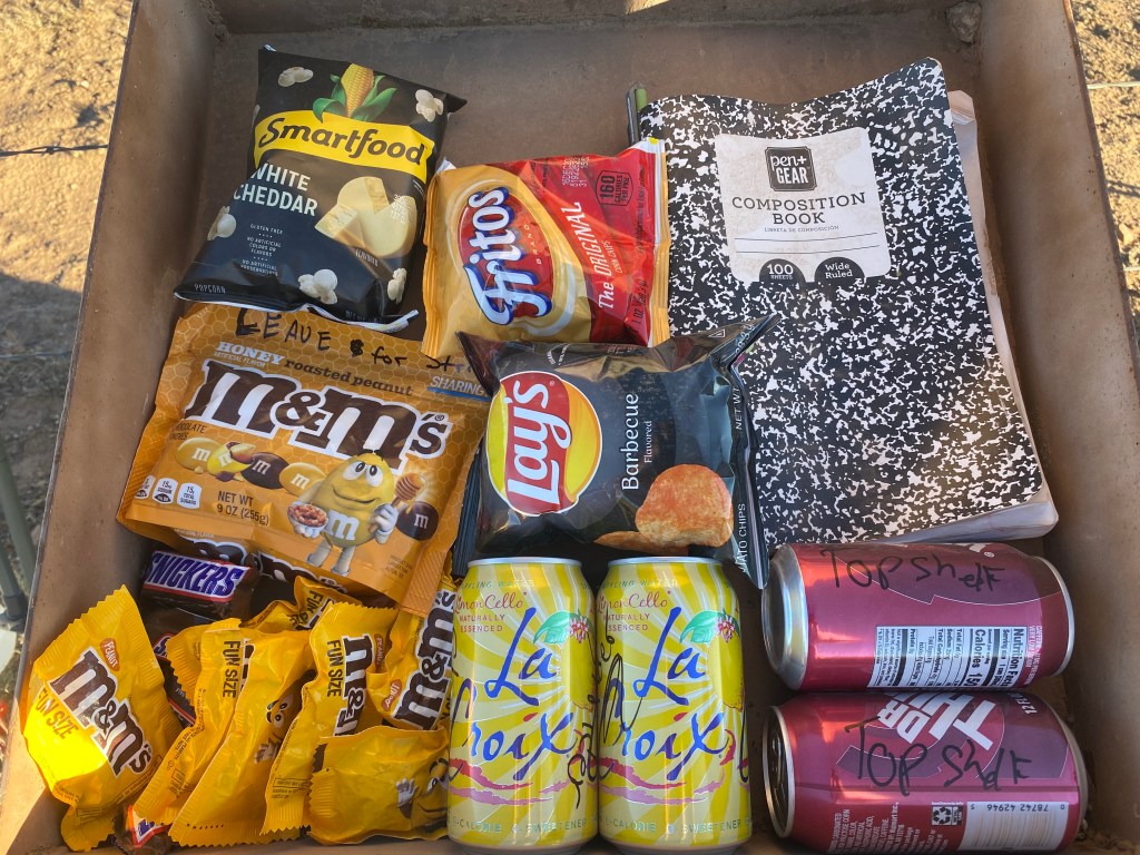 With excitement, we reached the Hwy 163 cache and found water, sodas, and PowerAde. Inside the trail register, there was a pouch of Honey Roasted M&Ms labeled “Leave for Strider”, drinks with each of our names, chips, and candy. Awhh Quick Draw! What a guy for leaving us such fabulous trail magic in a remote location! The log book had only two fall entries, neither sounding like thru-hikers. We sat next to the register, where we snacked and drank. Though we had over an hour of daylight left, we decided to camp in the spot to make the most of consuming our good fortune.