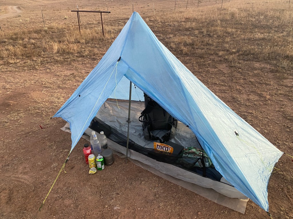 After passing through the day’s eighth gate, of multiple closure types, the trail became well trodden. Our original plan was to camp at the water cache that we hid on our last day with Quick Draw. However, Top Shelf’s nausea continued and she felt fatigued, likely side effects of the Giardia meds. We stopped at a large cattle pond so that I could fill a liter of water then camped at a nearby road crossing. As we ate dinner, a nearly full moon shone down and lit our tents.