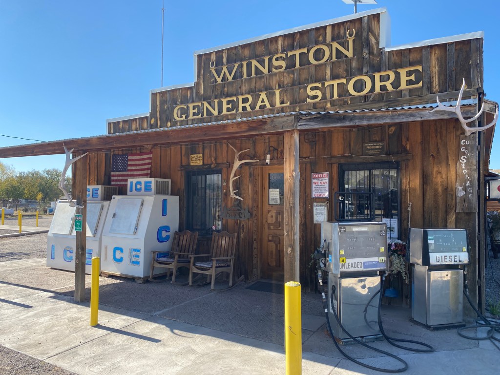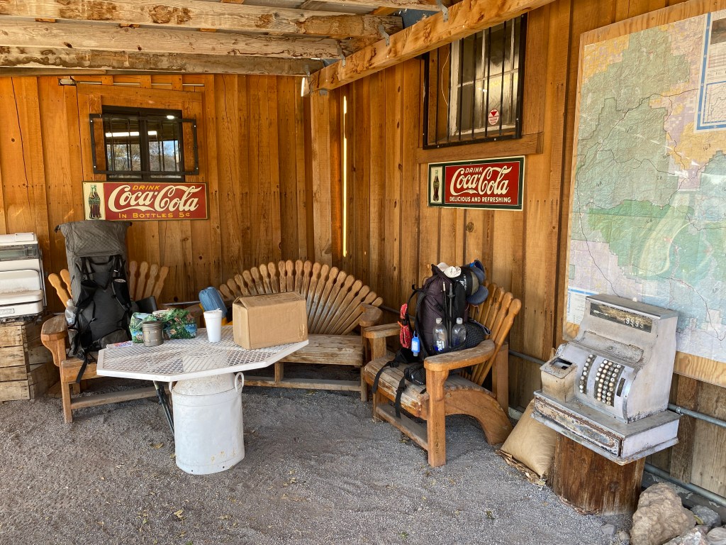 Our hunter pal dropped us at the Winston General Store. A cute, outdoor area with a table & chairs became our hangout. We each got coffee, a banana, and other snacks. After we ate, I went to the post office and Top Shelf returned to the store. We each sorted and organized our resupply. Using my box, she mailed home several extra items. I went back inside the store for more snacks. We walked to the south end of town to see if Crossbow Coffee was open; it was closed for the season.