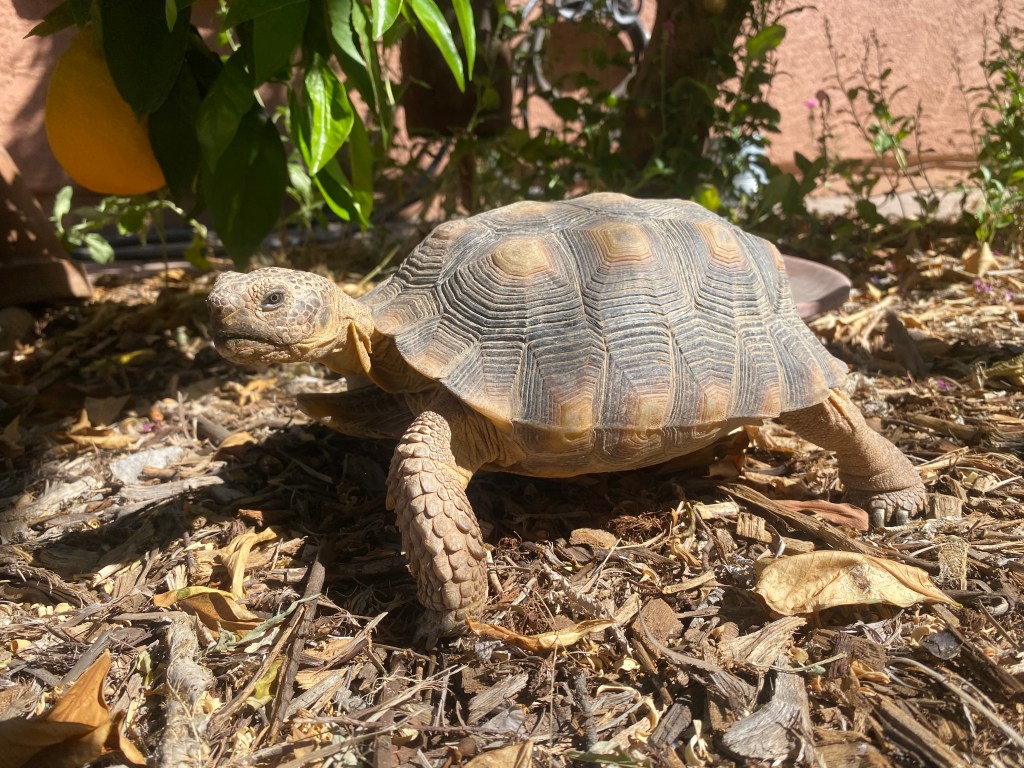 When I finished my winter pet-sitting job, I flew to Phoenix and stayed with friends. We had fun: playing board games, eating yummy meals, identifying butterflies and lizards at Hoyt Arboretum, and attending a banana ball game. They had a new dog who was anxious, yet a real sweetie. I helped them train him around new people. And they had a desert tortoise, a rescue who had lived with other humans for a decade, in the backyard. I fed him hibiscus leaves and stroked his head. He had an earthen den for hibernating during the winter months.