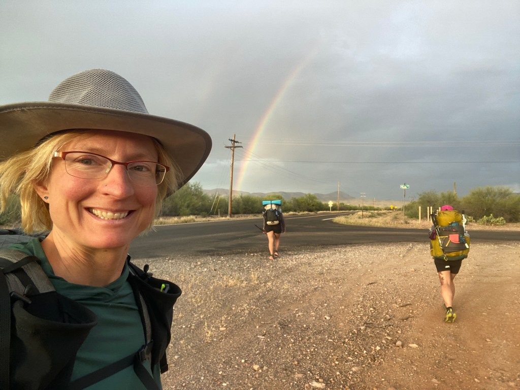 We left the library and stopped for dinner at a cute, local Mexican restaurant. Then we went to the Circle K and filled our water bottles. It didn’t take long, standing by the highway, to get a ride from a nice lady named Betty. She took us nine miles north and let us out at Aravaipa Canyon road. There was a quick rain fall while we were in the car. As we walked along the paved road, a beautiful rainbow, faintly double, decorated the sky. A lovely way to begin the journey!